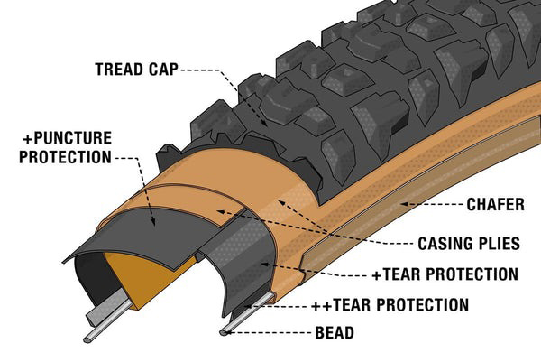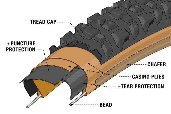 最近の自転車のタイヤのほとんどは、「ケーシング」と呼ばれるものを作るために複数の素材の層で構成されています。ケーシングは、さまざまな乗り心地を提供するために、さまざまな方法で構築できます。