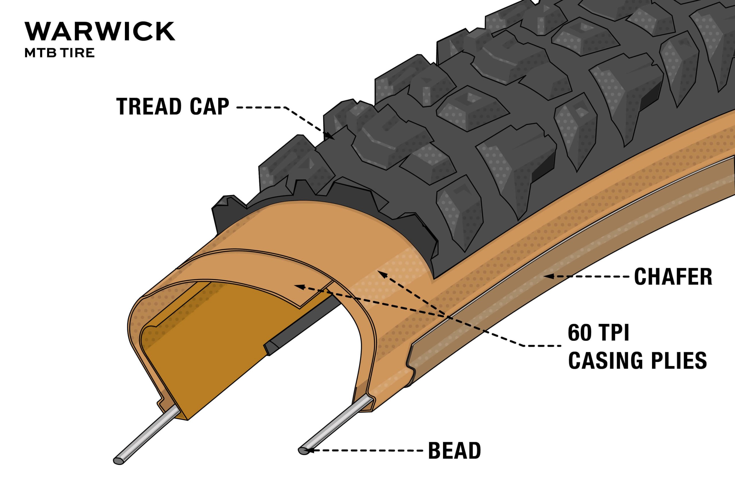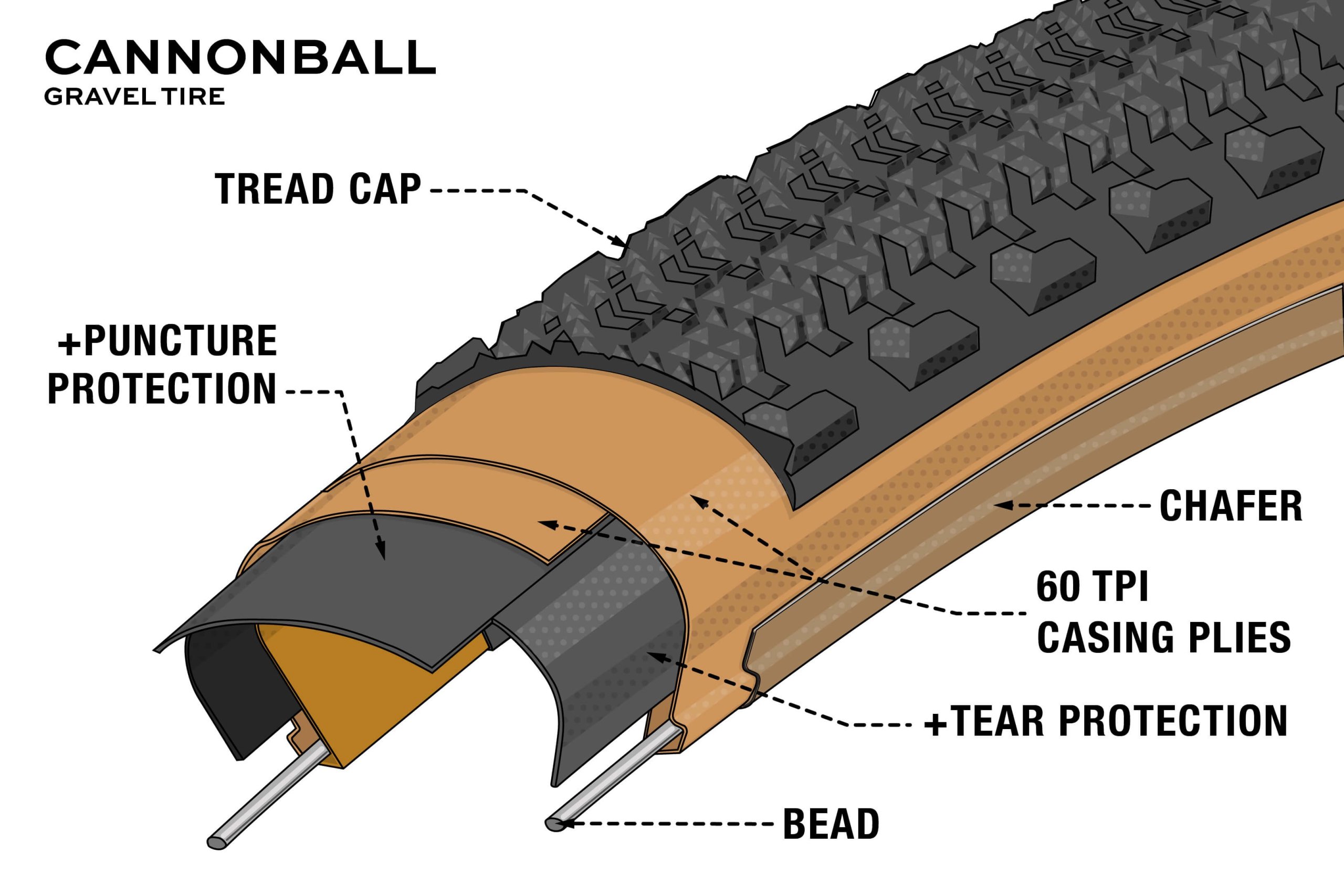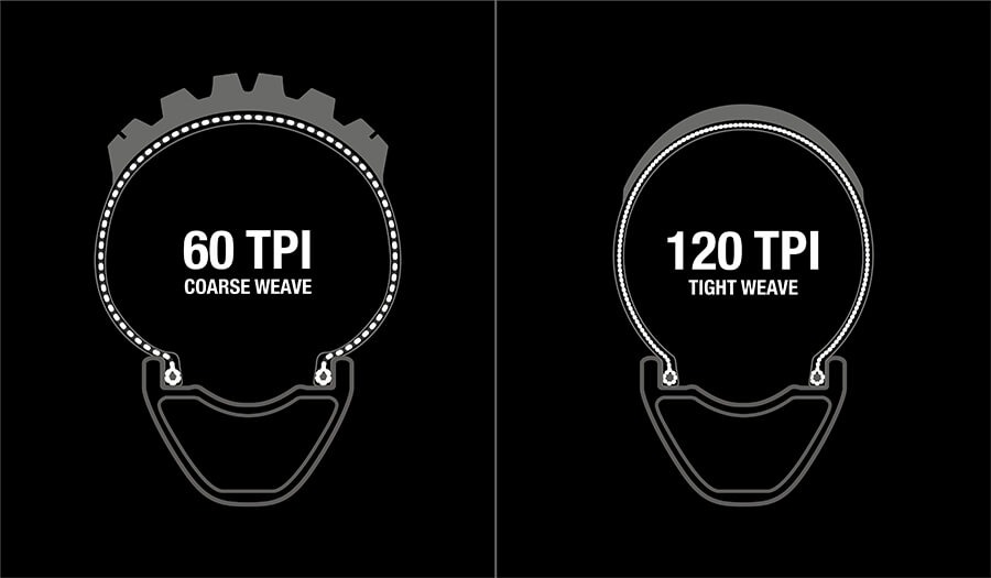 重量と転がり抵抗を重視する場合は、60TPI以上のケーシングのタイヤが必要になります。とはいえ、TPIは方程式の一部にすぎません。高いTPI(120+)は、かつてはレース志向のタイヤケーシングの主要な指標でしたが、チューブレスタイヤ、特にMTBカテゴリーにおいてタイヤケーシングがより構造的な役割を果たすようになるにつれて、これは変化しています。