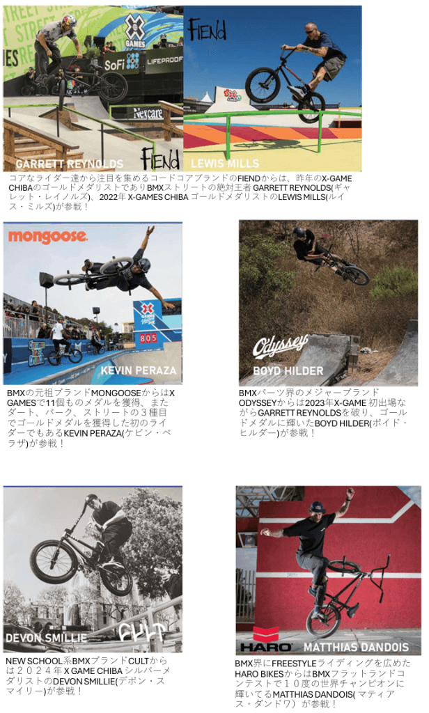 X-GAMES会場内、モトクロスインターナショナルブースにてX-GAMEに出場しているライダーがサポートを受けているBMXブランドなどなど弊社が