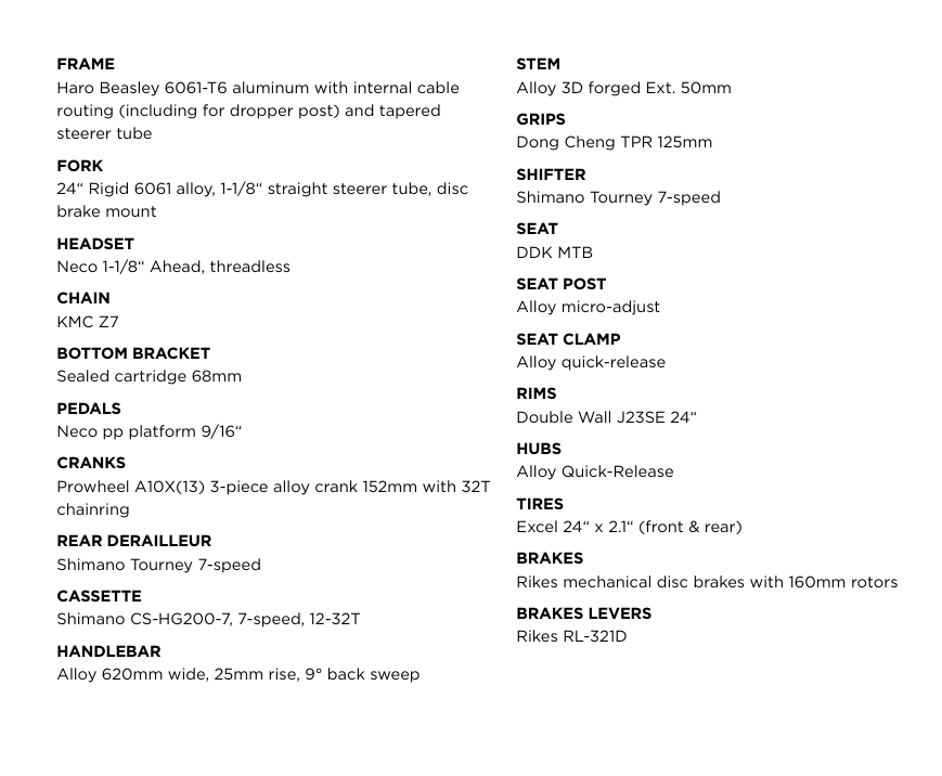 HARO BIKES BEASLEY 24 商品名 BEASLEY 24 価格 税込¥57,200 サイズ WHEEL SIZE 24”【122~142㎝】 カラー Gloss Stone/Semi-Gloss Black カテゴリー 完成車 輸入品の為告知無しでスペック変更することがありますのでご了承ください。 SPEC 関連商品 harobikes完成車 HARO BIKES DOWNTOWN 16 税込¥59,400 HARO BIKES DOWNTOWN18 税込¥61,600 HARO BIKES Burgess 税込¥82,500 HARO BIKES CLAIREMONT 税込¥99,000 HARO BIKES Dana 税込¥99,000 HARO BIKES Hoover 税込¥118,800 関連商品 harobikes HARO BIKES DOWNTOWN 16 税込¥59,400 HARO BIKES DOWNTOWN18 税込¥61,600 HARO BIKES Burgess 税込¥82,500 HARO BIKES CLAIREMONT 税込¥99,000 HARO BIKES Dana 税込¥99,000 HARO BIKES Hoover 税込¥118,800 PRODUCTS LIST商品一覧ページ SHOP LIST販売店検索ページ BRANDS LISTブランド一覧ページ
